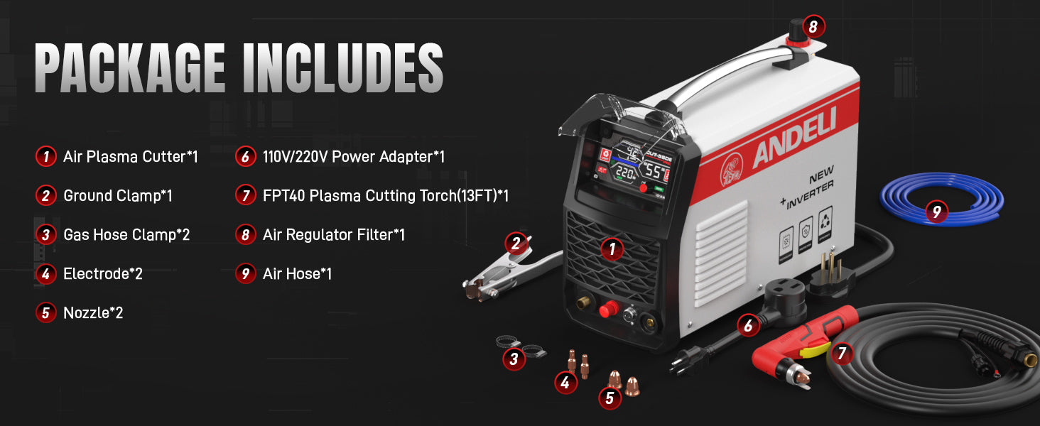 The ANDELI CUT-55DS Pro Plasma Cutter is a powerful and versatile cutting machine designed for precision metal cutting in workshops, garages, and industrial environments. Equipped with Non-HF blow-back pilot arc technology, dual-voltage compatibility, and a large LED digital display, this plasma cutter delivers stable arc ignition, smooth cuts, and reliable performance on a wide range of metals.