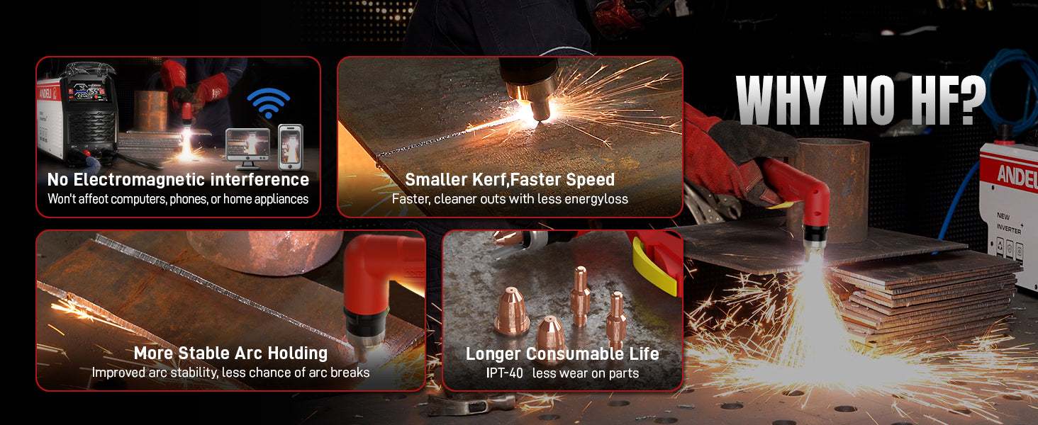 The Non-HF blow-back pilot arc start ensures smooth arc ignition without high-frequency interference. This technology protects nearby electrical equipment and provides a safer working environment.