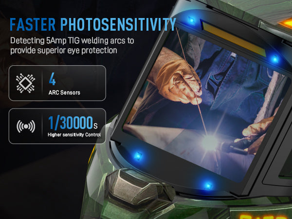 - 【1/30000s Fast Auto-darkening】 Upgraded auto-darkening lenses with 4 premium arc sensors, switching from light to dark in 1/30000s. Easily adjust the shade and sensitivity of the lenses for different working environments, perfect for STICK/MIG/TIG welding,grinding and cutting.500mAh rechargeable battery with solar supports up to 1200+ hours of continuous welding.