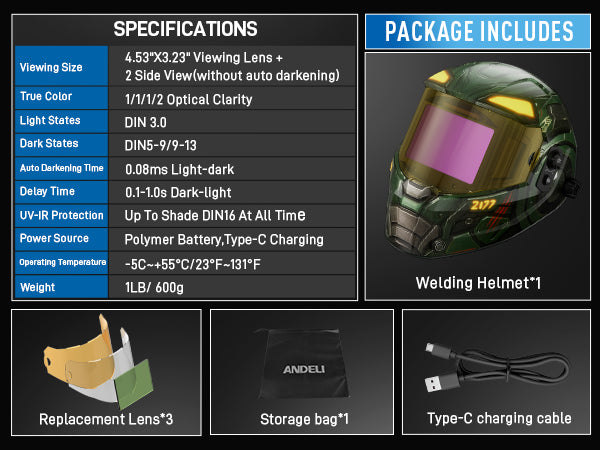 BrandANDELISize7.2" x 3.2"StyleTempest Guardian GreenColorTempest Guardian GreenItem Weight0.6 KilogramsMaterialPlasticClosure TypeBuckleManufacturerANDELIModel NameOPTIM-600LBPart NumberAMZRLOPTIM01-USFBAItem Weight1.32 poundsProduct Dimensions10 x 2 x 2.7 inchesItem model numberOPTIM-600LB-BCBBatteries1 Lithium Polymer batteries required. (included)Included ComponentsWelding Helmet*1; Replacement Lens*3, Storage Bag *1, Type-C USB cable *1Batteries Included?YesBatteries Required?YesBattery Cell TypeLithium PolymerWarranty Description1 year